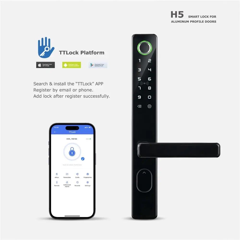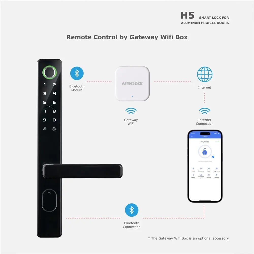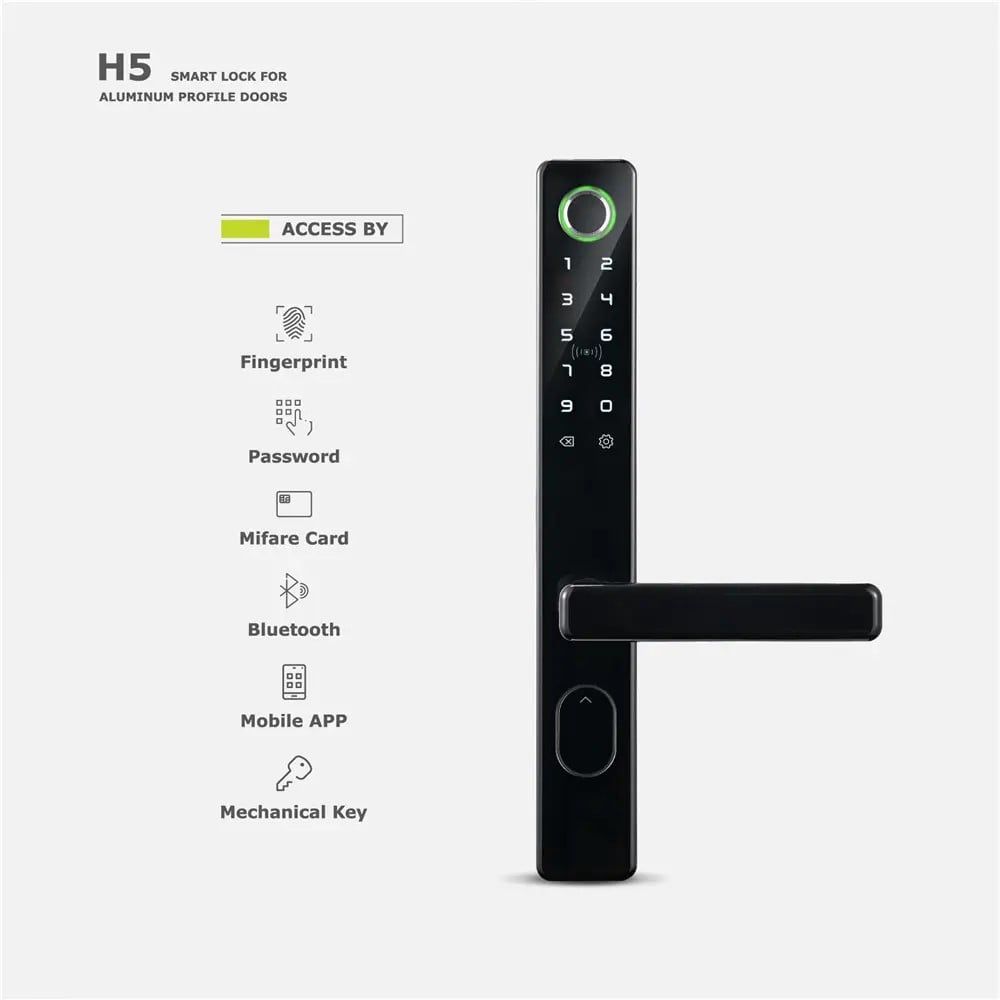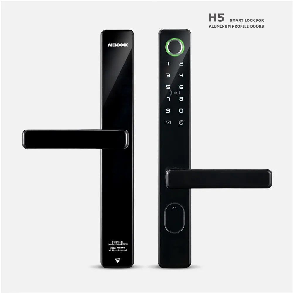 Khóa cửa điện tử vân tay MENDOCK H5 “mẫu khóa quốc dân cho cửa nhôm xingfa” với tính năng quản lý và mở cửa từ xa bằng điện thoại có tiếng Việt hoàn toàn độc lập. Chất liệu: Hợp kim nhôm CNC Nguồn điện: 4 pin AA cho số lần mở cửa 5000 lần (tương đương 1 năm sử dụng) Kiểu mở khoá 5 trong 1: Vân tay (Lưu 50), từ xa bằng điện thoại (phần mềm tiếng Việt), mật mã (50), thẻ từ (200), chìa khóa cơ (2 chìa). 👉 APP Bluetooth: mở khóa trong khoảng cách 3m 👉 APP Wifi - điều khiển và kết nối quản lý từ xa qua Internet Cổng USB dự phòng hết pin: Micro USB Phần mền: Tiếng việt, hỗ trợ Iphone + Android
